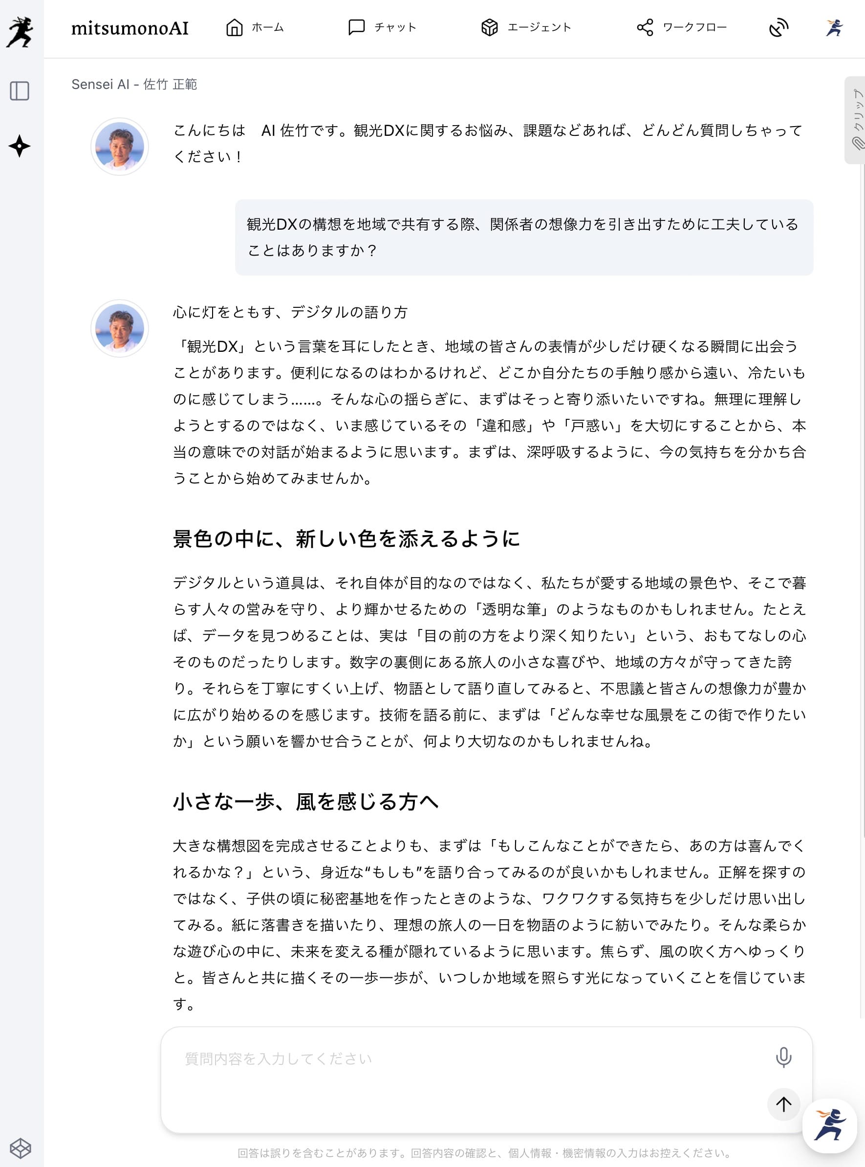 中でも、本実証事業で特に注目を集めたのが、公益財団法人福井県観光連 観光地域づくりマネージャーの佐竹正範氏の知見を組み込んだ「Sensei AI 佐竹正範」です。ここでのポイントは、単なる“伴走支援の代替”ではなく、専門家の相談体験を「プロダクトの機能」として組み込んだことにあります。つまり、人が支援したから成果が出たのではなく、相談・壁打ちを必要とする業務に対して、相談できる仕組みをシステム側に実装した、という位置づけです。