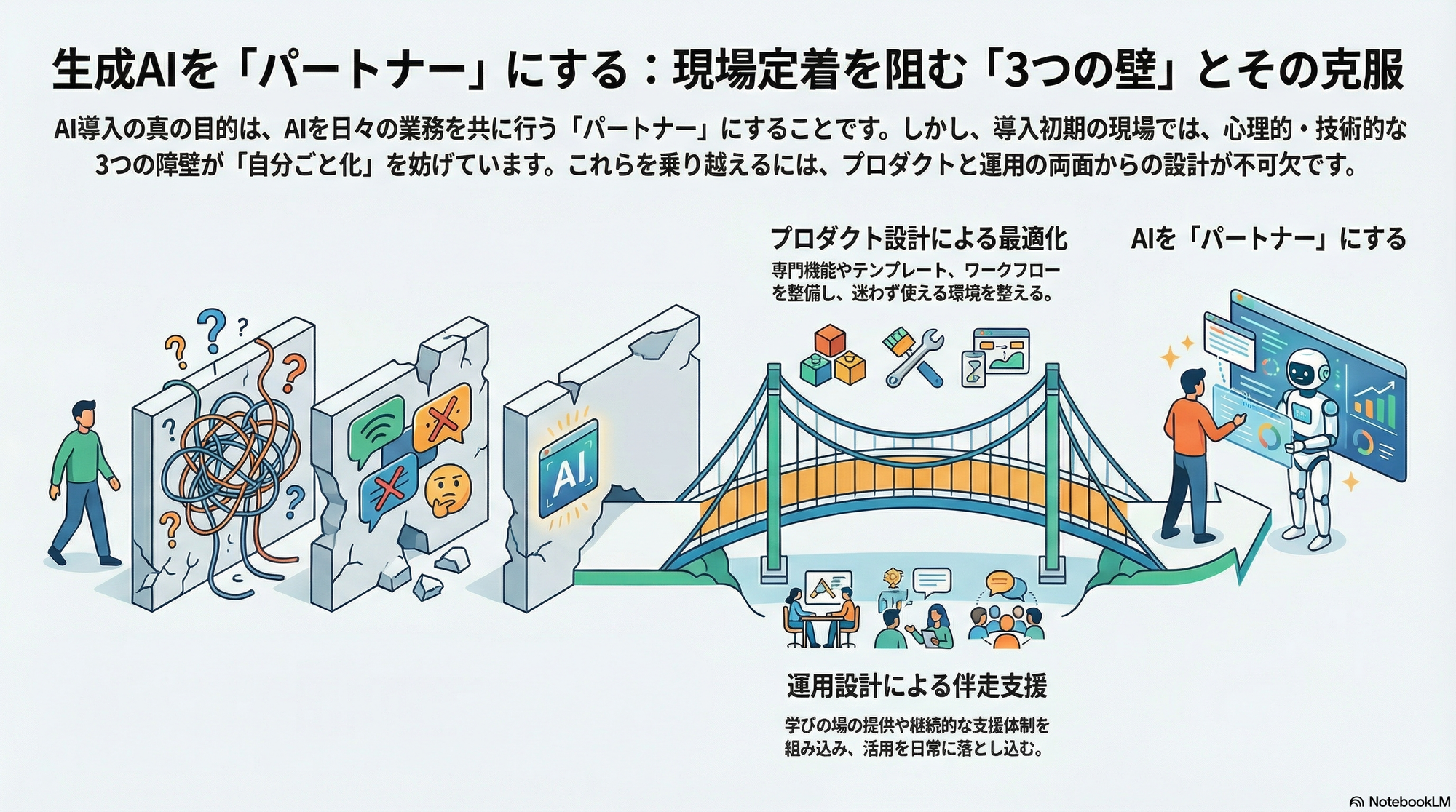 これらの3つの壁は、生成AIの可能性を「日常業務」という具体的な文脈に落とし込む際、誰もが直面する本質的な課題でした。だからこそ本実証では、プロダクト側の設計(専門機能・入力項目・テンプレート・ワークフロー)に加え、運用設計(学びの場・導線・伴走・継続支援)を組み合わせて、壁を越えるためのモデル化を試みました。